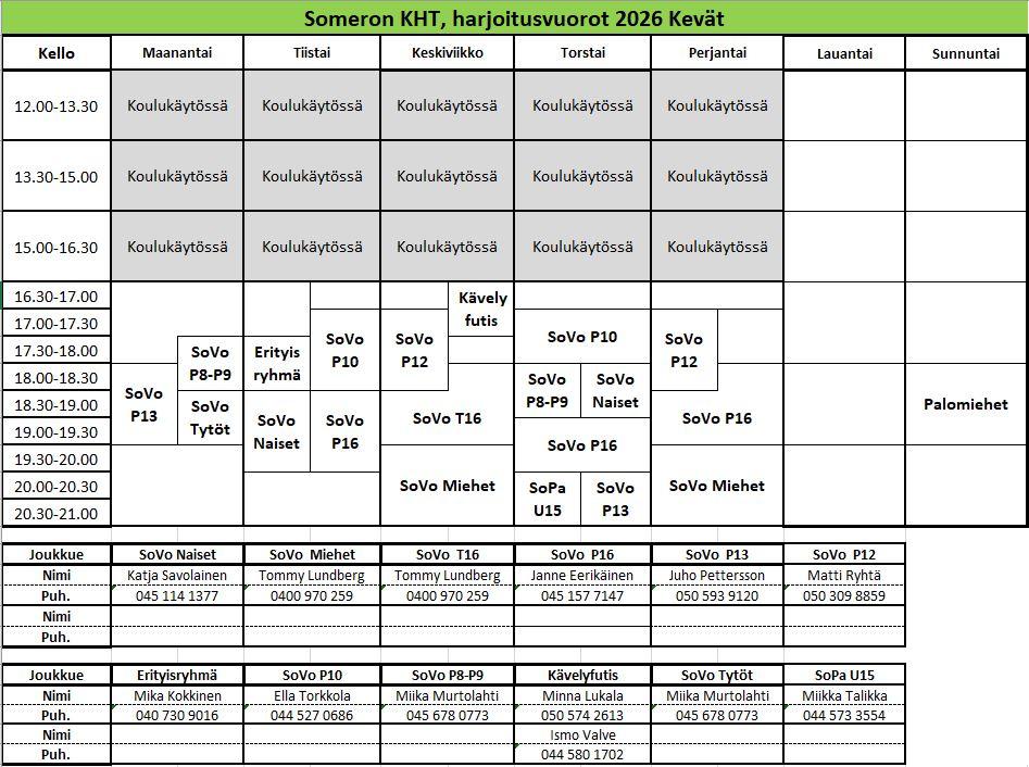 Harjoitusvuorot kevätkaudelle 2026: